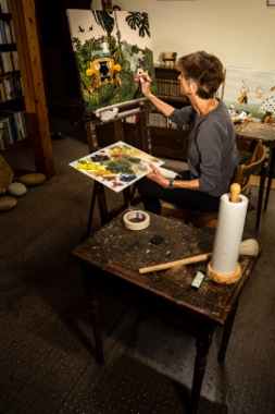 Pour atteindre ce résultat, elle utilise une technique exigeante : plusieurs couches fines de couleur, glacis successifs et vernis spécifiques.